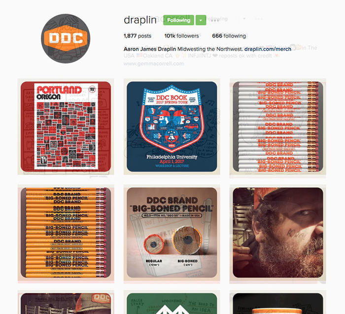 Aaron Draplin is one of the most influential designers working today. His work is smart, clean, bright and a little retro. His simple personal philosophy “Do good work, for good people.” is evident is everything he shares and creates. He is also one of the few accounts I’ve seen that utilize a distinctive frame around all posted photos to further enhance his signature look.