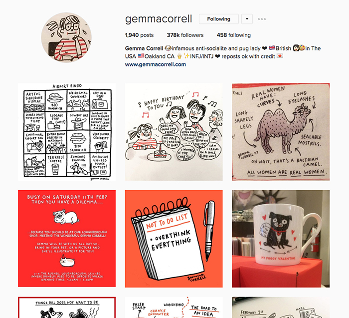 Anna also gets inspiration and laughs from Gemma Correll, a self-proclaimed infamous anti-socialite and pug lady. “She’s an illustrator who makes me laugh and frequently say, ‘yes. That is me.’ She has a very distinct style that she sticks to, so you always know her stuff when you see it. Plus, her wordplay and puns make me laugh and keep me thinking about fun ways to use words.”