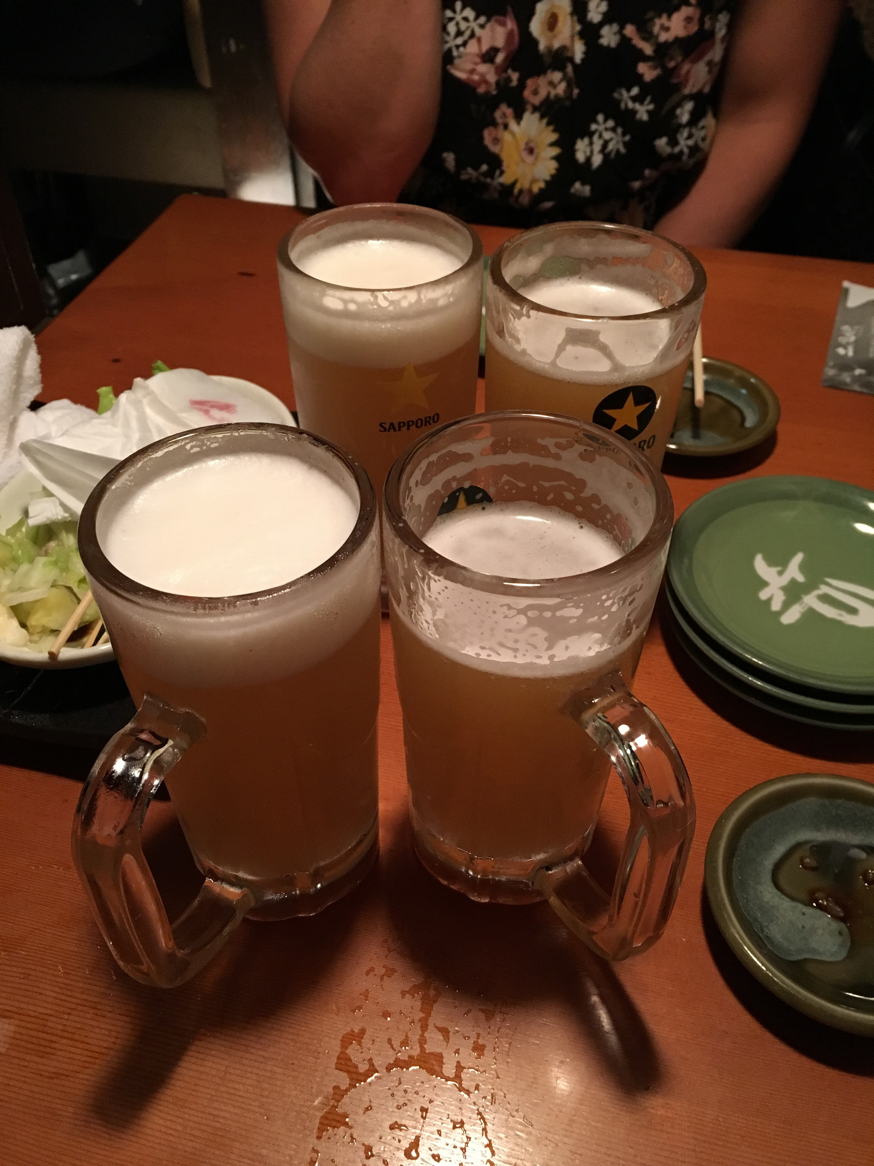 Once we were ready to grab dinner, we decided to duck into this authentic Japanese restaurant to try some local fare. Here is where we came across our first true language barrier. Nothing major, in fact some may say you can never have too many beers, but when ordering our food and drinks I noticed that even simple questions about the portion sizes were a struggle. This made me a little nervous but hallelujah Japan has a tried and true language of images on their menus! So again I resulted to pointing and nodding to communicate what I would like.