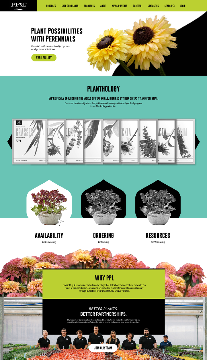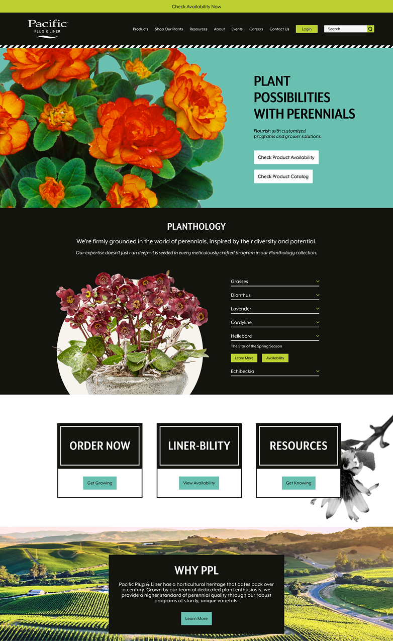 More aligned with the client’s original ask, the second concept was heavily influenced by the existing website and brand elements that the client was still loving—repurposing and modernizing them for a revitalized look. Focused on closeups and spotlights of lush PP&L plants, elegant moments of color and simplified patterns, this minimal approach guided the user to eye-catching perennial varieties and easily digestible information.