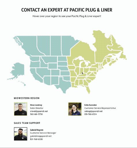 We were excited to modernize the website with some movement. Working with our developer, we created an interactive map that displayed the appropriate sales representative for each region when a user hovered over it.